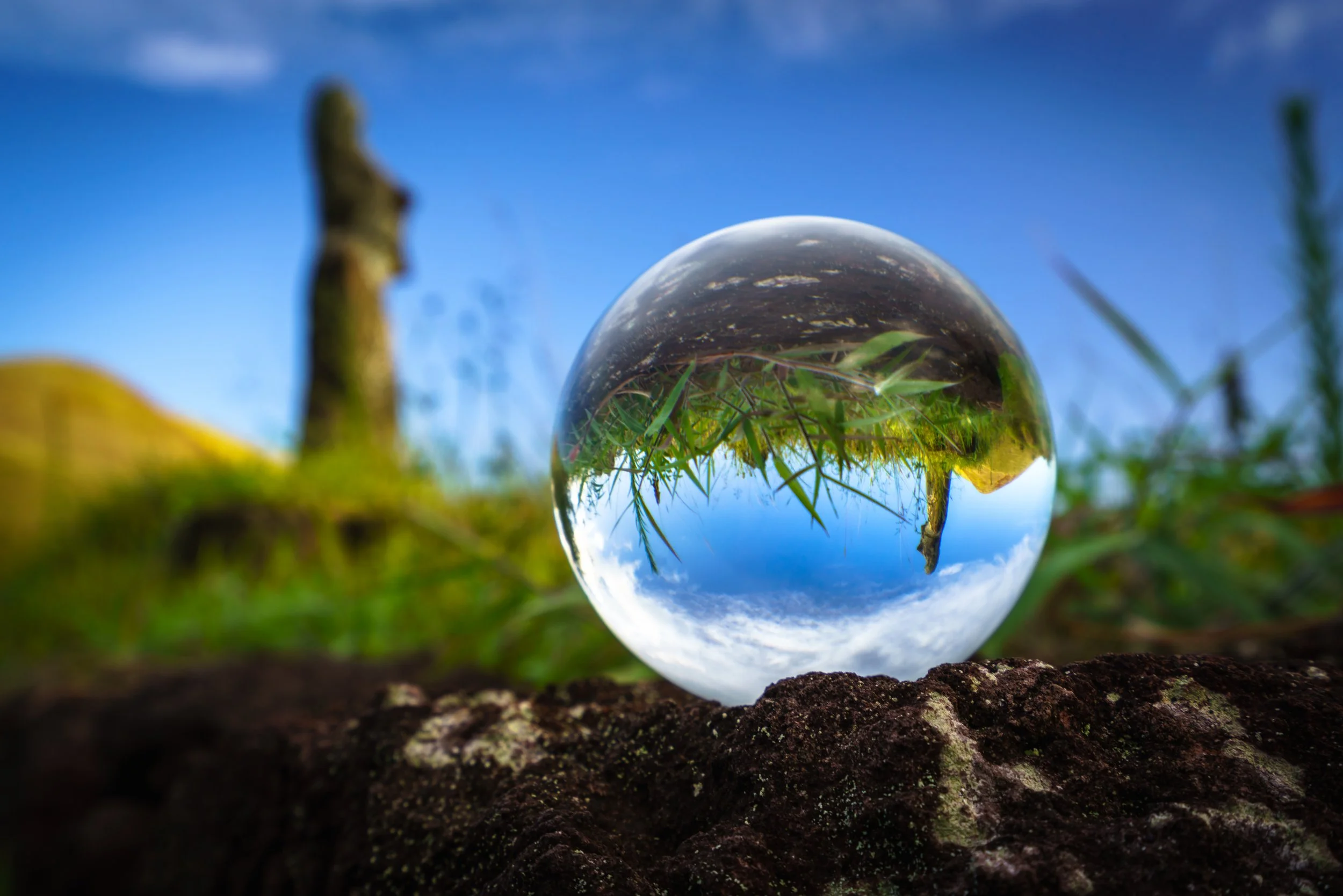 The Rapa Nui site at Ahu Huri a Urenga is, for two reasons, unique amongst Easter Island’s Polynesian archaeological treasures. First, the complex, which is astronomically aligned, is a solar observatory. Carefully positioned stone holes would collect water and reflect star patterns, thereby heralding weather cycles and seasons. Secondly, the lone moai atop the ahu has two pairs of hands, engraved into its back; nobody can figure out why. This photo shows Huri a Urenga reflected in a crystal ball.