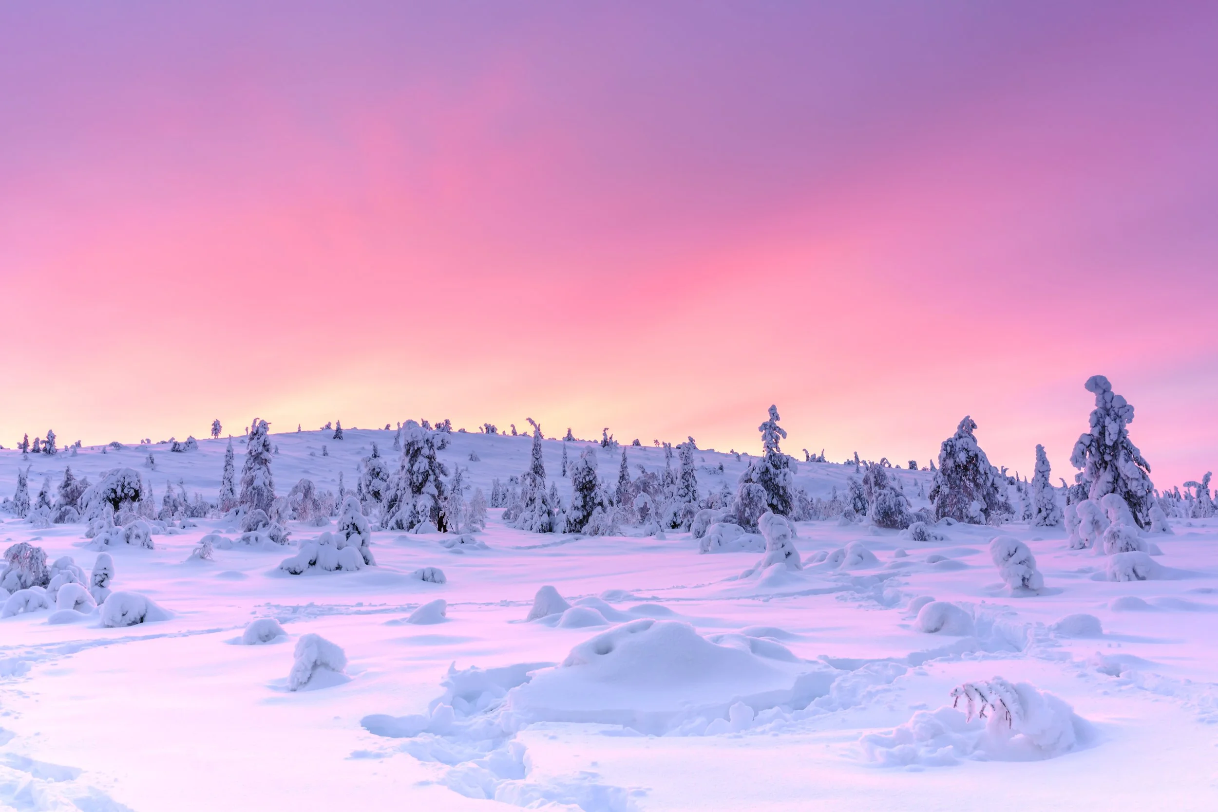 Polar night occurs in the northern and southern extremities of the planet when the sun stays below the horizon for 24 hours. In the most extreme longitudes, polar night can last for 179 days. The best lighting conditions are the polar twilight, when there is no true daylight but the scattering of light particles by the upper atmosphere creates an ethereal blend of pinks, purples and yellows. Finland in early January is an ideal location, as seen here at the magical Riisitunturi National Park.