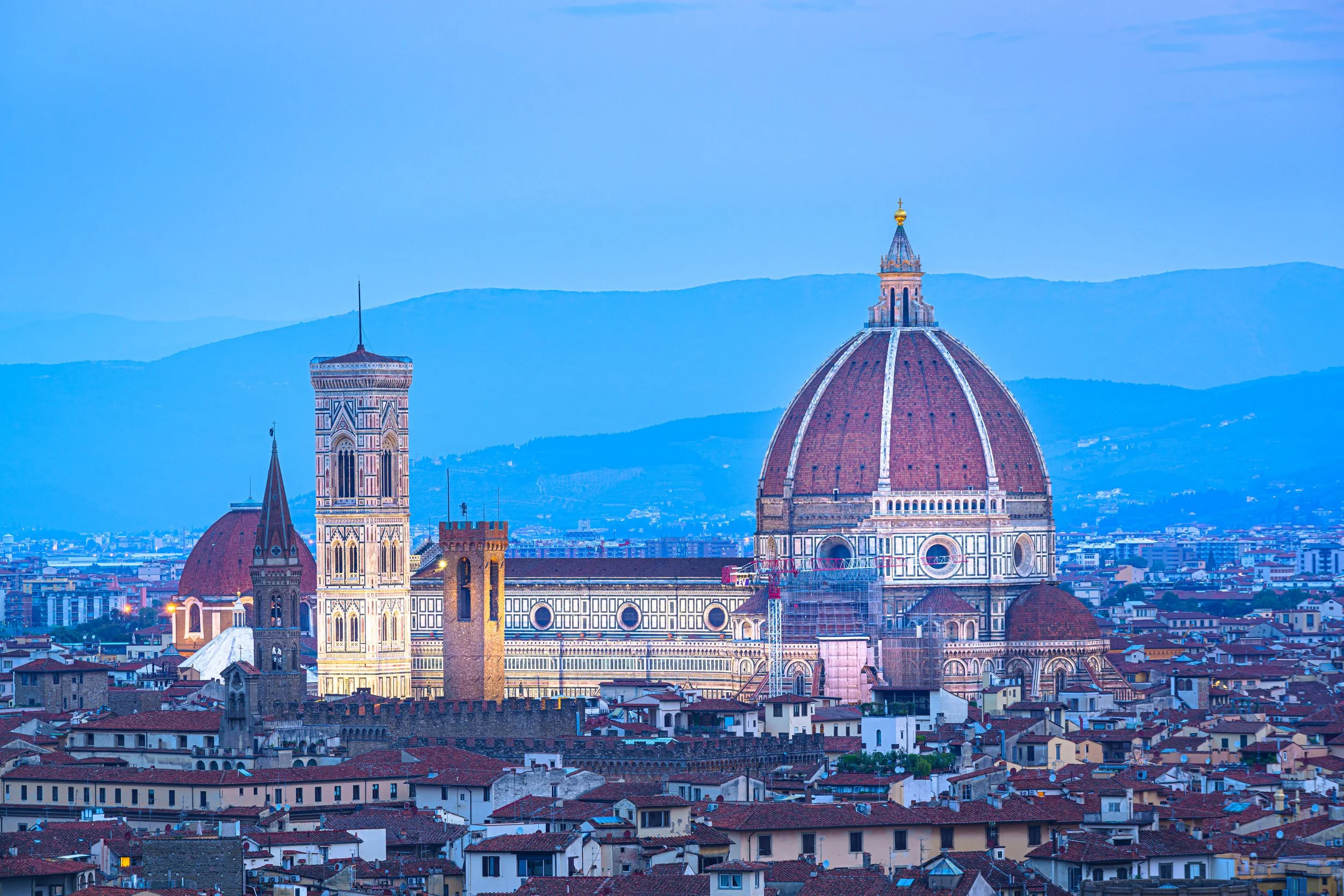 The Cattedrale di Santa Maria del Fiore towers over the Italian city of Florence and is, perhaps, the quintessential icon of the Renaissance. Whilst construction was started in 1296, it was only completed in 1436, with Brunelleschi’s magnificent Duomo as its centrepiece. At the time, the Duomo was the largest masonry dome in the world – and it remains so to this day. These photographs show the cathedral in the last light of a summer’s day, when the pinks fade to blue and the spotlights take over.
