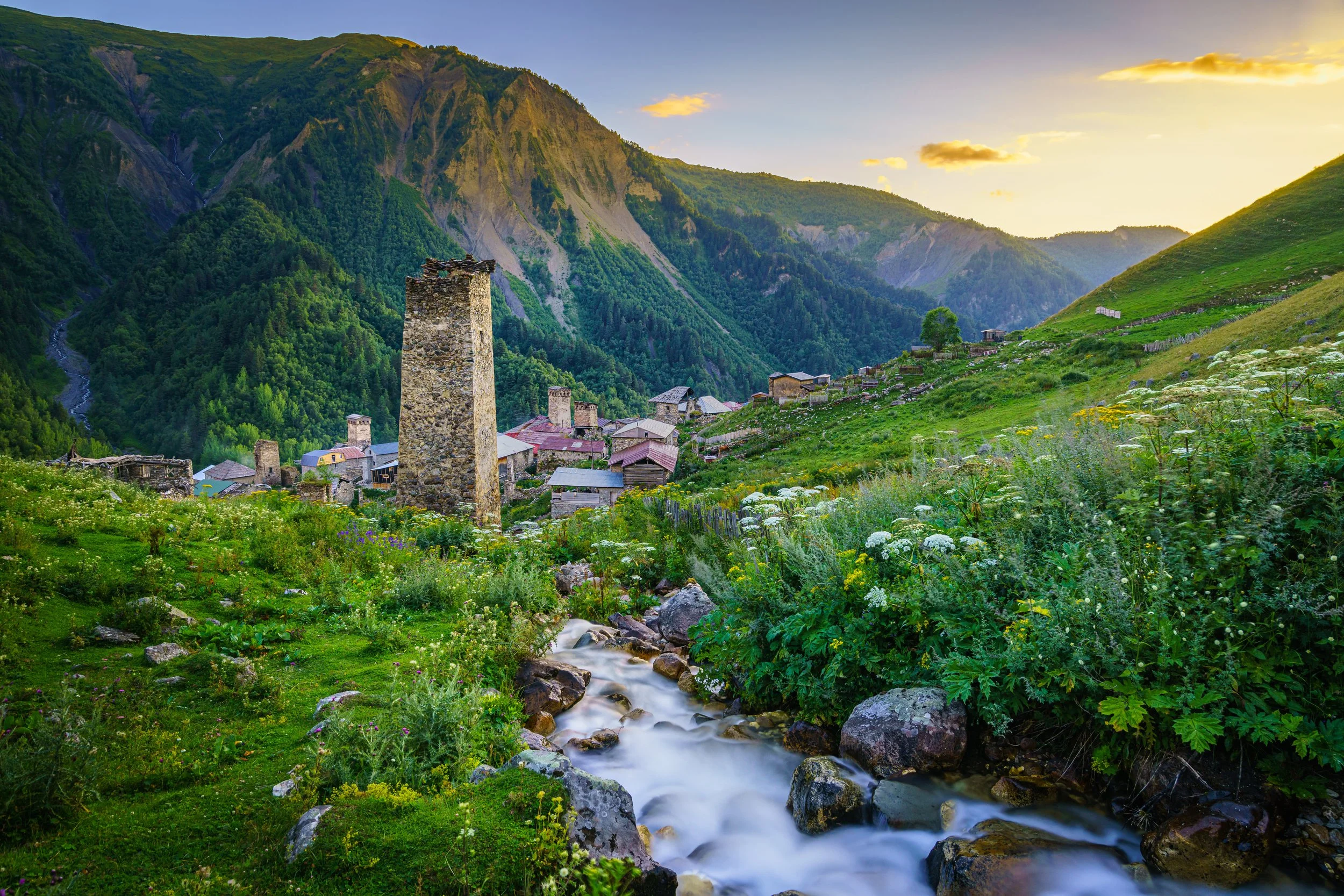 In a remote mountain valley in a remote country of mountain valleys lies the village of Adishi, accessible only on foot or by hoof over a high pass. Distinctive defence towers, so typical of the Svaneti region in northern Georgia, stand next to fast-flowing waterfalls and wild flowers. It was here that the oldest surviving Georgian gospels (from 897) were sent by Queen Tamar for safekeeping, and were kept hidden for almost a millennium by local Svan families. The village is now a resting point in the stunning four-day trek between Mestia and Ushguli.