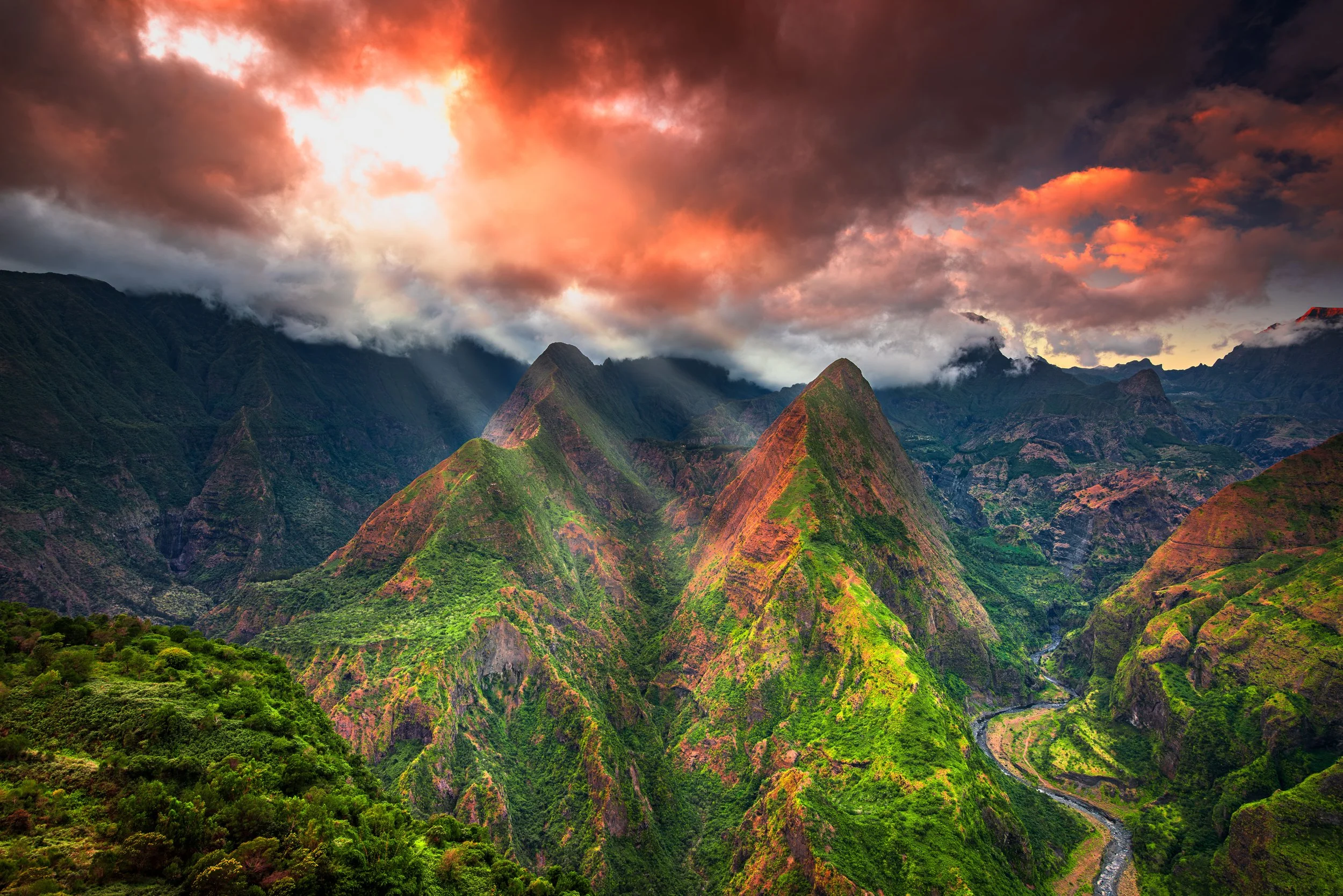 The interior of the Indian Ocean island of La Réunion contains a series of collapsed calderas known as “cirques”. They are the remnants of violent volcanic eruptions of aeons past and scar the island like giant pockmarks. The cirques are now forested hinterlands, inaccessible and uninhabitable to all but the hardiest. This image shows the Cirque de Mafate from its edge at Cap Noir, accessible after a toe-curling drive up to 1,150m above sea level. Mafate is even more remarkable because it has a permanent population, who live off-grid in tiny hamlets, without roads or mains electricity: either you walk in or you fly in.